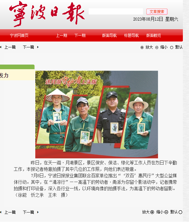 皎阳似火,喜讯传来。近日,我司98098彩票荣登宁波日报,新闻报道了天一阁·月湖景区,景区保安、保洁、绿化等工作人员在烈日下辛勤工作。作为一家以专业提供安保、安检服务,本着为客户提供安逸的工作生产环境、让客户放心满意及牢记“铸安全盾牌,立服务口碑”的立业宗旨的保安公司荣登当地官媒报道,这是对企业自身领域的高度认可,我会对此其获此荣誉表示热烈的祝贺!