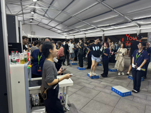 观众们开始陆续进入会场,安检员们维持好秩序的同时开始检票和安全检查。